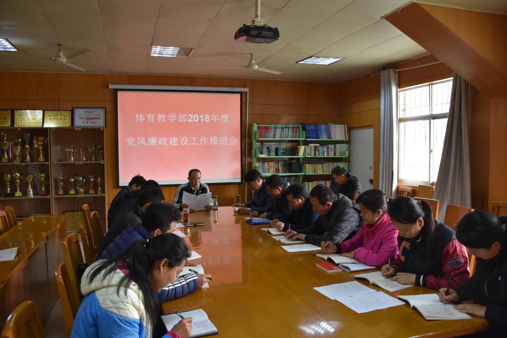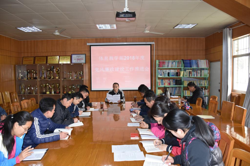 为落实全面从严治党主体责任,贯彻执行党风廉政建设责任制,体育教学部于3月30日上午8点30分,召开2018年度党风廉政建设工作推进会,全体党员教职工参加了本次会议。