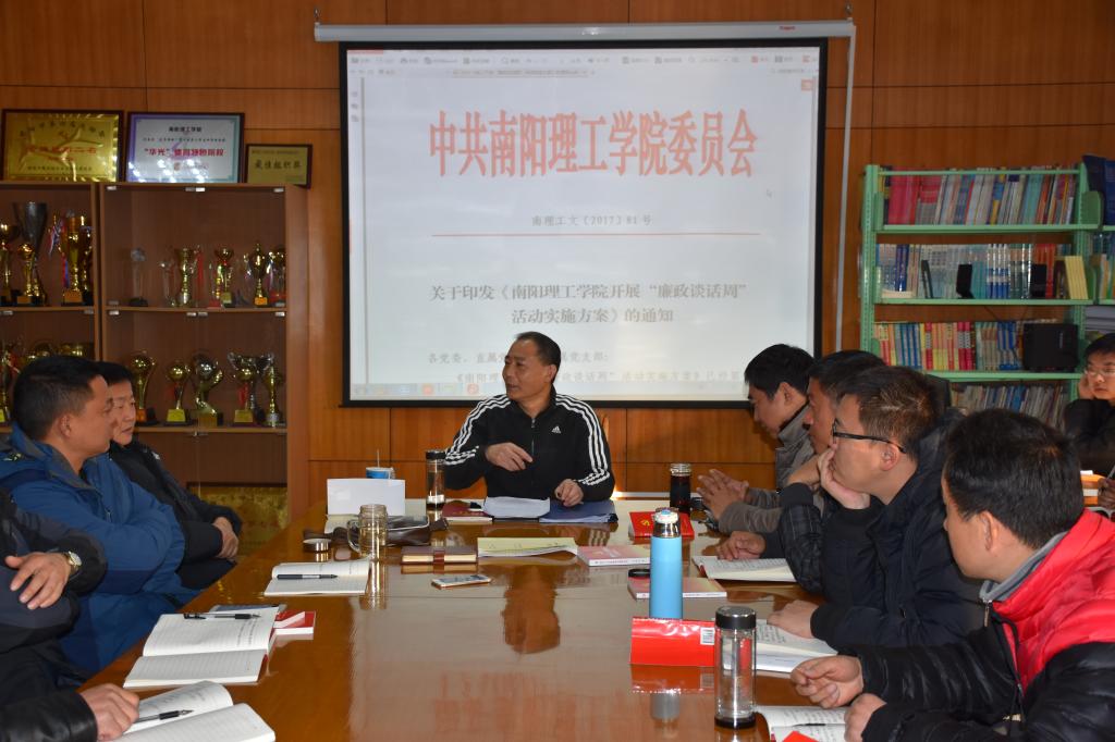 隋晓航同志首先在会议上传达了《南阳理工学院开展“廉政谈话周”活动实施方案》文件相关内容。传达文件之后,隋晓航同志围绕“贯彻执行党的路线、方针、政策,特别是遵守政治纪律和政治规矩、贯彻上级决策部署的情况,落实全面从严治党主体责任、履行“一岗双责”职责情况,贯彻民主集中制原则,坚持集体领导、民主作风、全局观念、团结同志,接受党内外监督的情况,加强作风建设,学习、遵守领导干部廉洁从政各项规定及报告个人有关事项,落实中央八项规定精神情况,对分管领域、职责范围内梳理权力清单、优化权力运行流程和廉政风险防控措施等情况,提醒全体党员特别是科级党员干部,通过对照党章、《中国共产党廉洁自律准则》、《中国共产党纪律处分条例》,以及中央、省委、市委有关党风廉政建设的要求,找差距、定目标,严格落实好元旦、春节期间党风廉政建设工作。