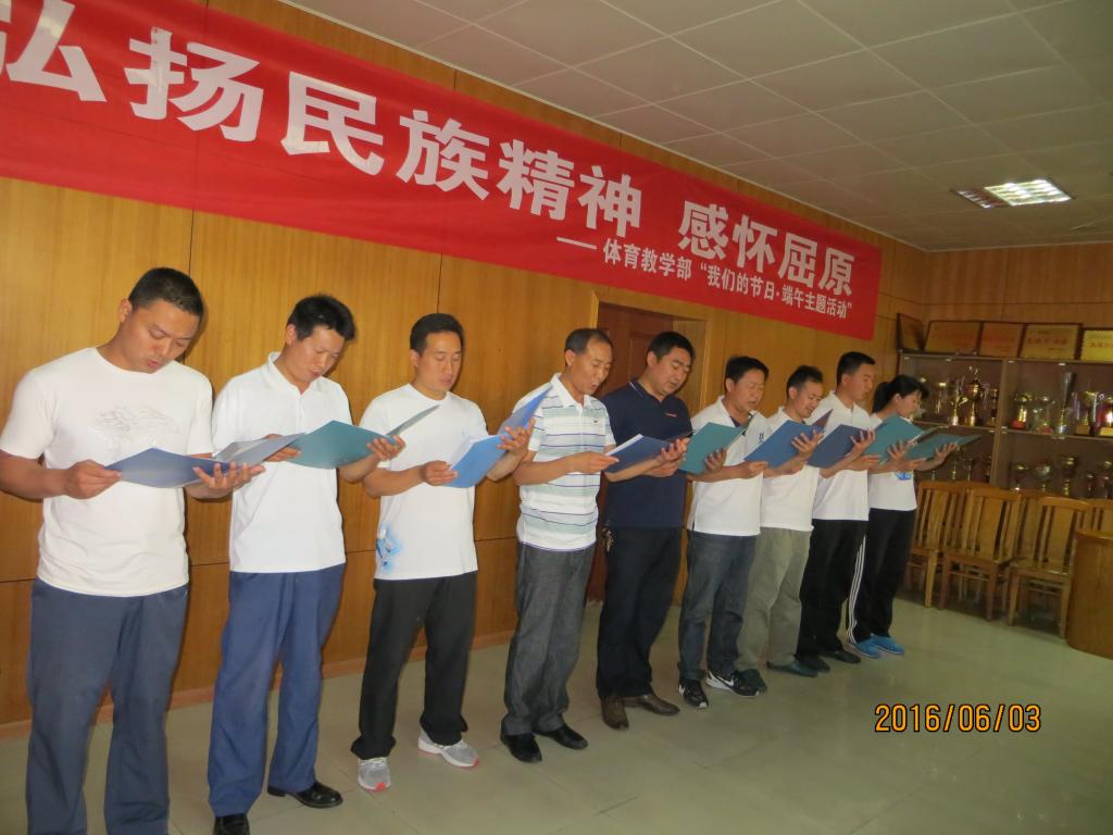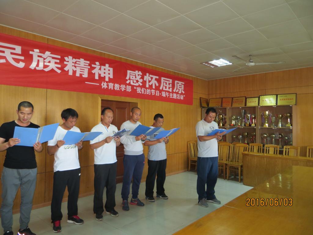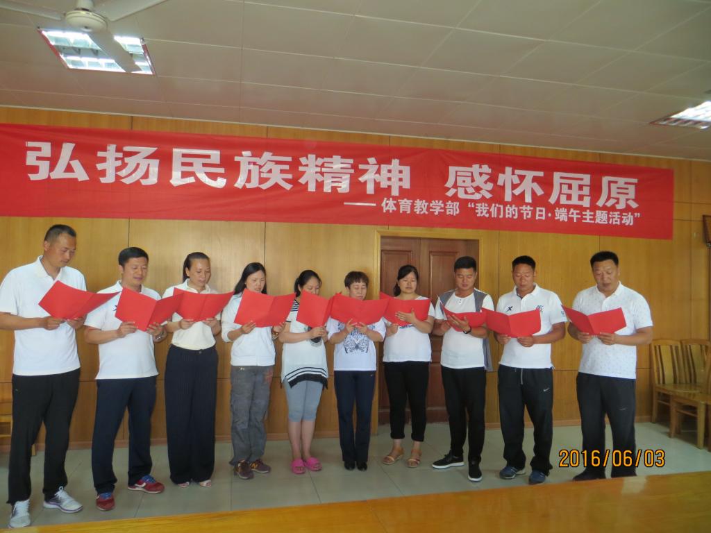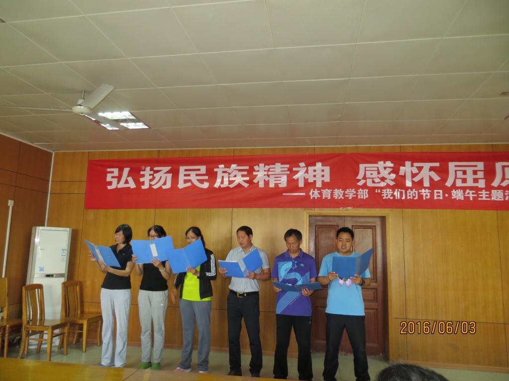 2016年6月3日下午5点,体育教学部如期举行了“我们的节日·端午”主题活动暨屈原诗歌朗诵比赛。本次比赛以部门为单位集体参赛(第一教研室、第二教研室、第三教研室、党政),总计有31名(3名教职工因事请假)参加了屈原诗歌朗诵比赛。
