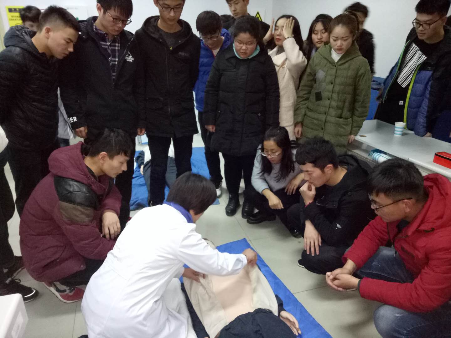 李忠副教授深入浅出地讲解了常见运动损伤的分类及各类运动损伤的一般性处理和院前急救方法。在讲座过程中,李忠老师与学生进行了现场互动交流。最后,李忠老师现场演示了心肺复苏方法,并亲自指导学生进行心肺复苏实践。
