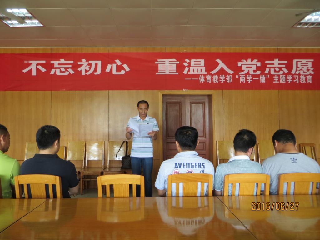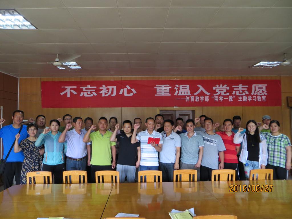 在体育教学部党支部书记隋晓航同志的带领下,全体党员集体重温入党誓词:“我志愿加入中国共产党,拥护党的纲领,遵守党的章程,履行党员义务,执行党的决定,严守党的纪律,保守党的秘密,对党忠诚,积极工作,为共产主义奋斗终生,随时准备为党和人民牺牲一切,永不叛党。 ”