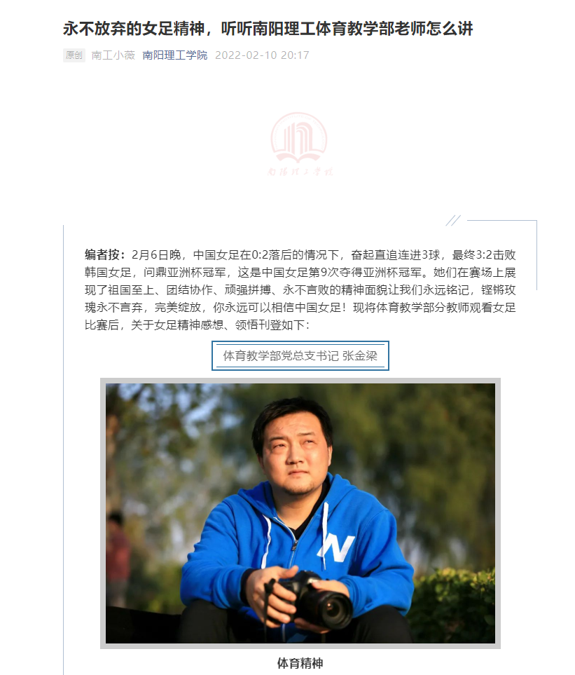 告别了寒假生活,南工学子们迎来了新的学期,在刚刚过去的寒假里,女足亚洲杯夺冠和冬奥会中国健儿的优异成绩成为中国人民的热议,体育教学部全体教职工创新教学模式,贴合学生实际,采用“线上+线下”混合教学模式让学生体会女足姑娘和冬奥健儿的坚持不懈、永不放弃的精神,助力学生健康成长。