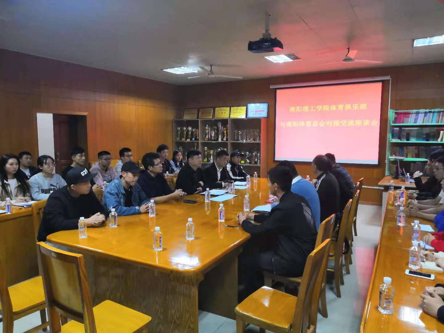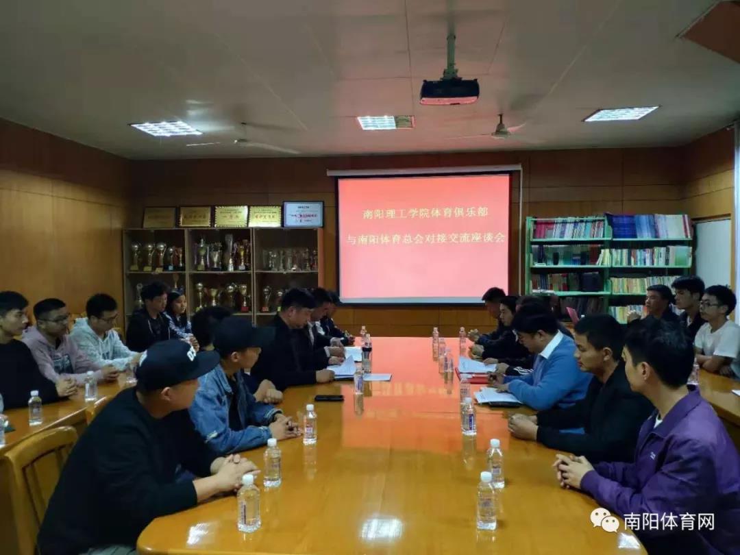 2018年10月26日晚上7:30,南阳理工学院体育俱乐部 与南阳体育总会对接交流座谈会在南阳理工学院体育教学部会议室召开。