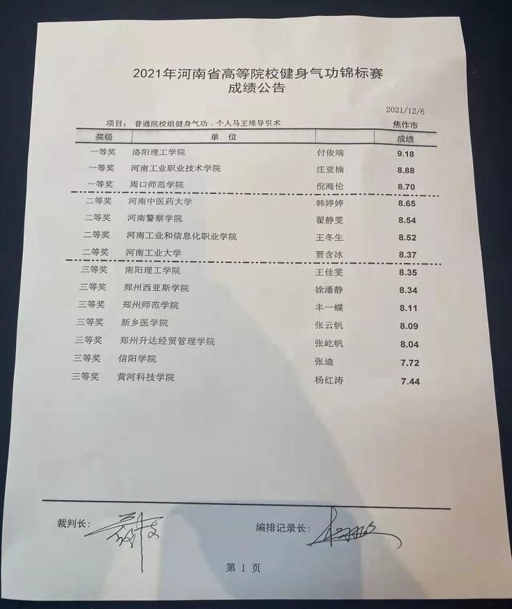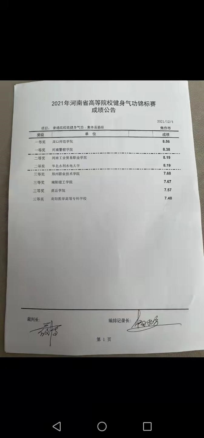 2021年12月由河南省体育局、河南省委政法委、河南省教育厅主办,河南省健身气功管理中心承办的河南省高等院校健身气功锦标赛中,南阳理工学院荣获个人易筋经、个人马王堆导引术、集体易筋经三项三等奖。