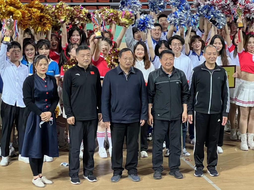 开幕式后,各学院代表队为观众奉献了精彩表演,经过评委打分,共十一支队伍获奖,张世海为获得特等奖的传媒学院“爱我一定队”颁奖