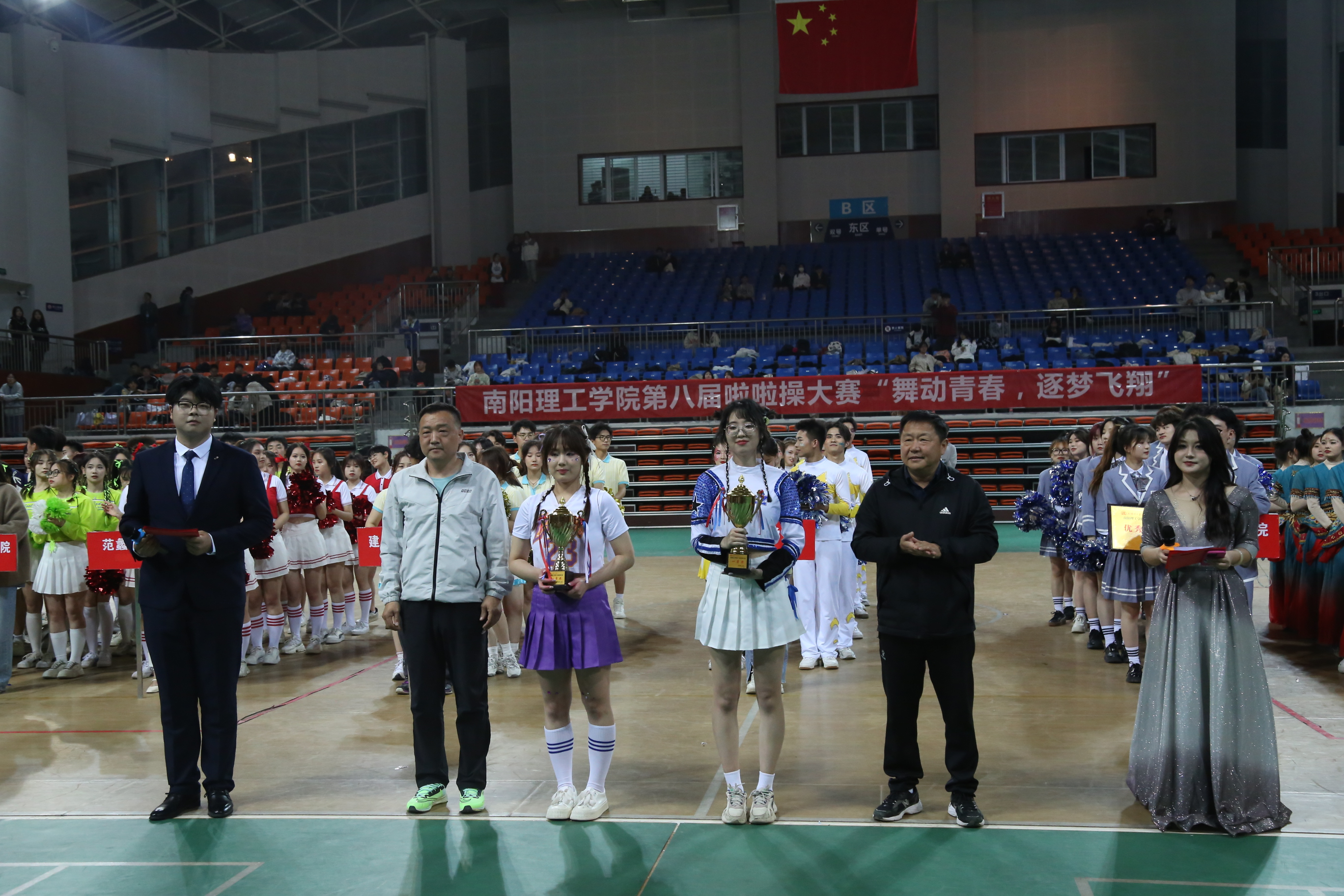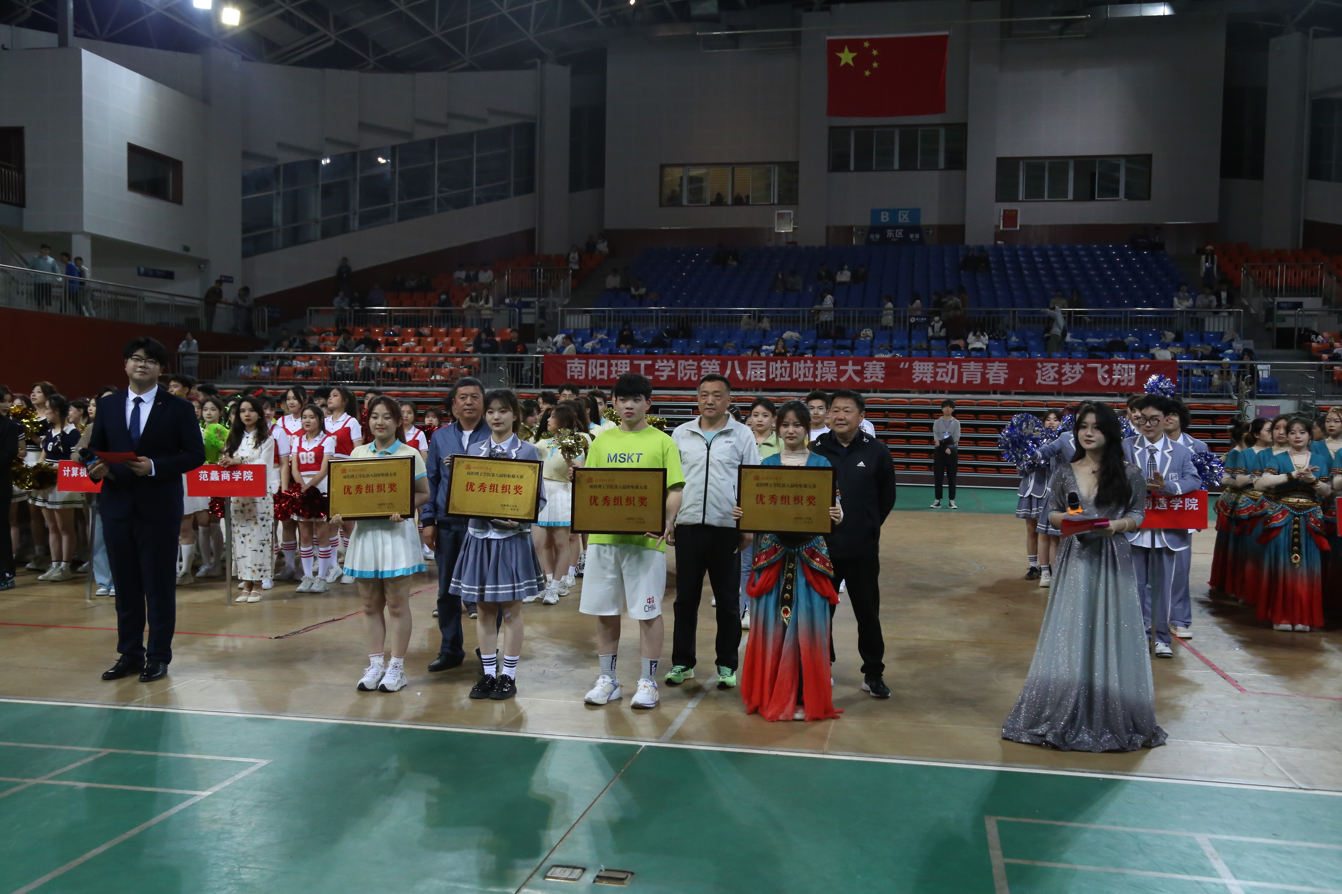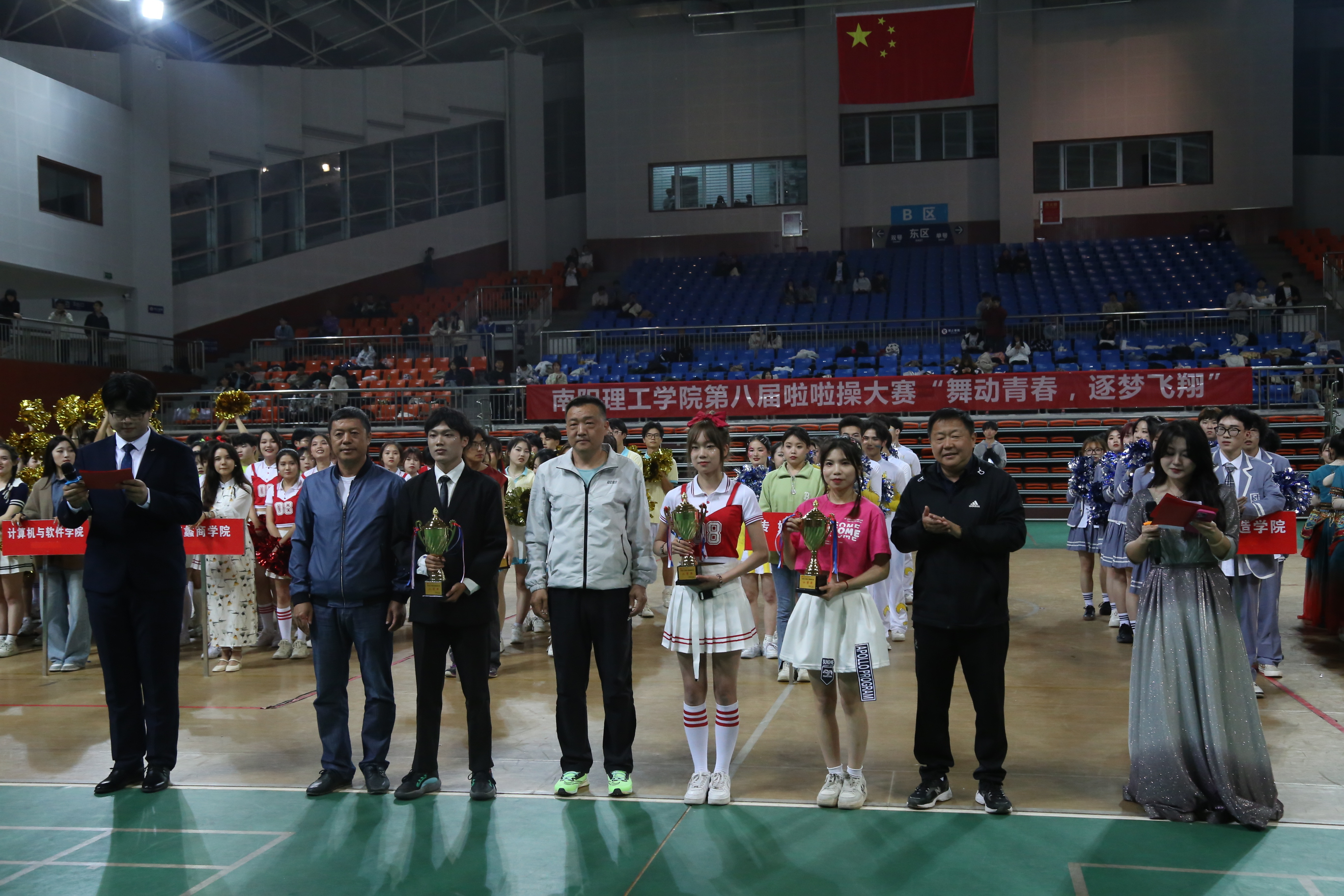 本网讯(特约通讯员/孙云彦 学生记者/纪明哲 齐鑫)5月6日,南阳理工学院第八届啦啦操大赛“舞动青春,逐梦飞翔”在东南校区体育馆二楼顺利举办,副校长张世海及体育教学部负责人观看比赛并为获胜队伍颁奖。