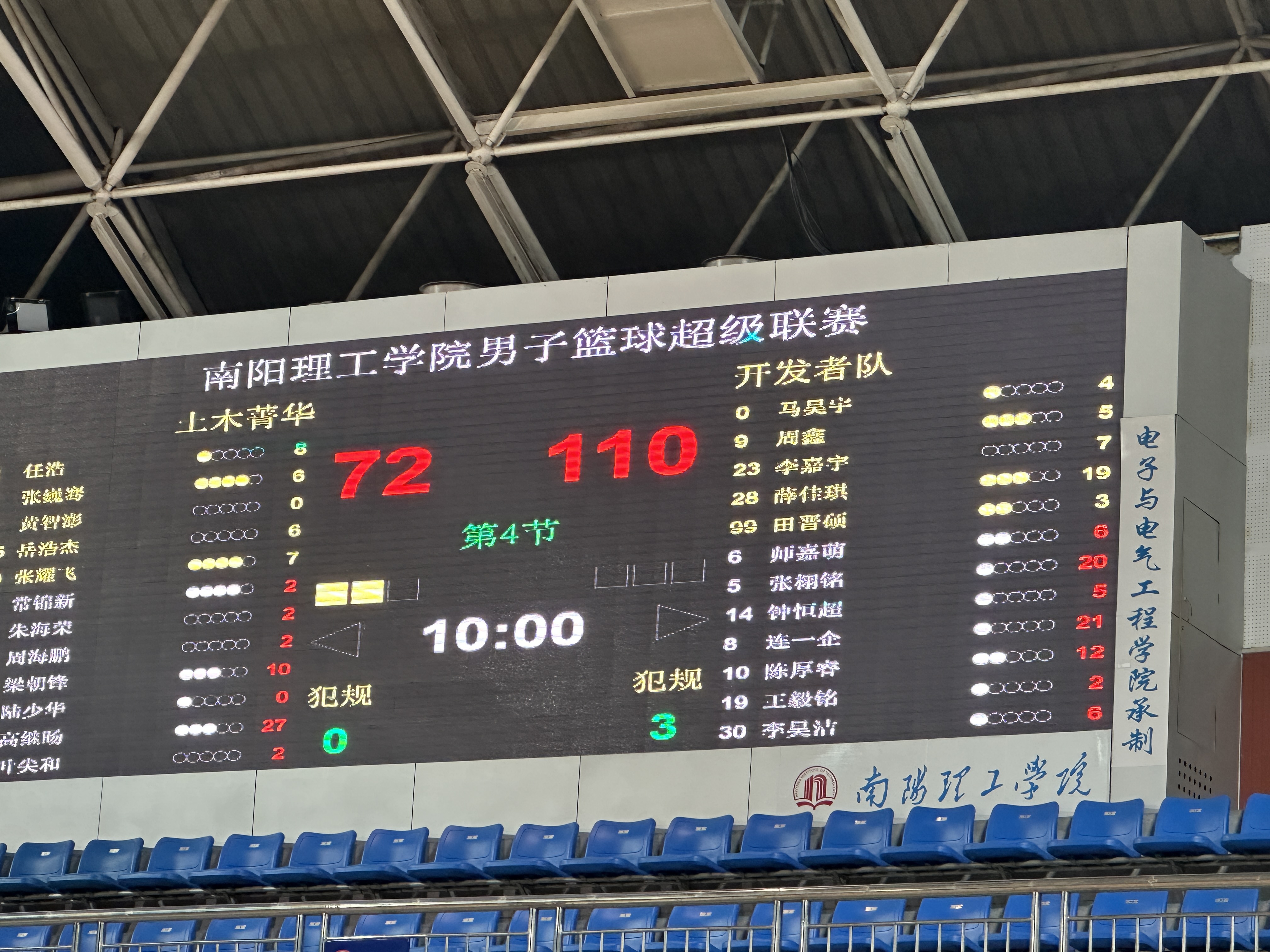 2025年5月27号晚七点,2024-2025南阳理工学院男子篮球超级联赛总决赛第二场在体育馆二楼如期举行,土木工程学院土木菁华队受制于人员不整和伤病困扰,72:110再败一场,系列赛大比分0:2落后,夺冠形势岌岌可危。土木工程学院土木菁华队两人得分上双,其中高继旸夺得全场最高分27分,计算机与软件学院开发者队四人得分上双。