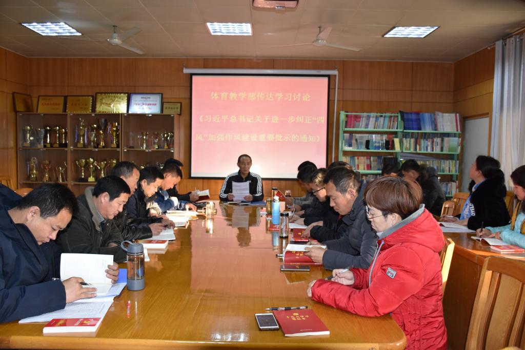 体育教学部党支部书记隋晓航同志首先传达了学校党委于12月20日召开传达的《中共中央办公厅印发习近平总书记关于进一步纠正“四风”加强作风建设重要批示的通知》相关精神。传达学习领会《通知》精神之后,隋晓航同志组织全体党员就如何贯彻落实《通知》精神进行了讨论。