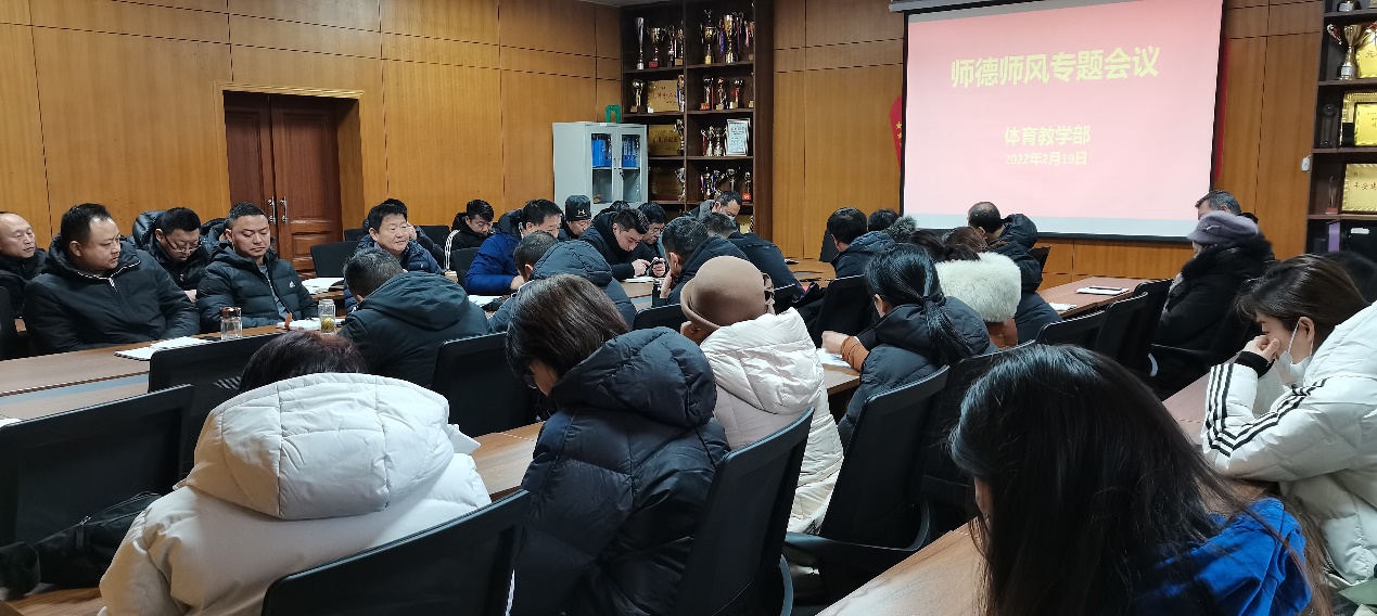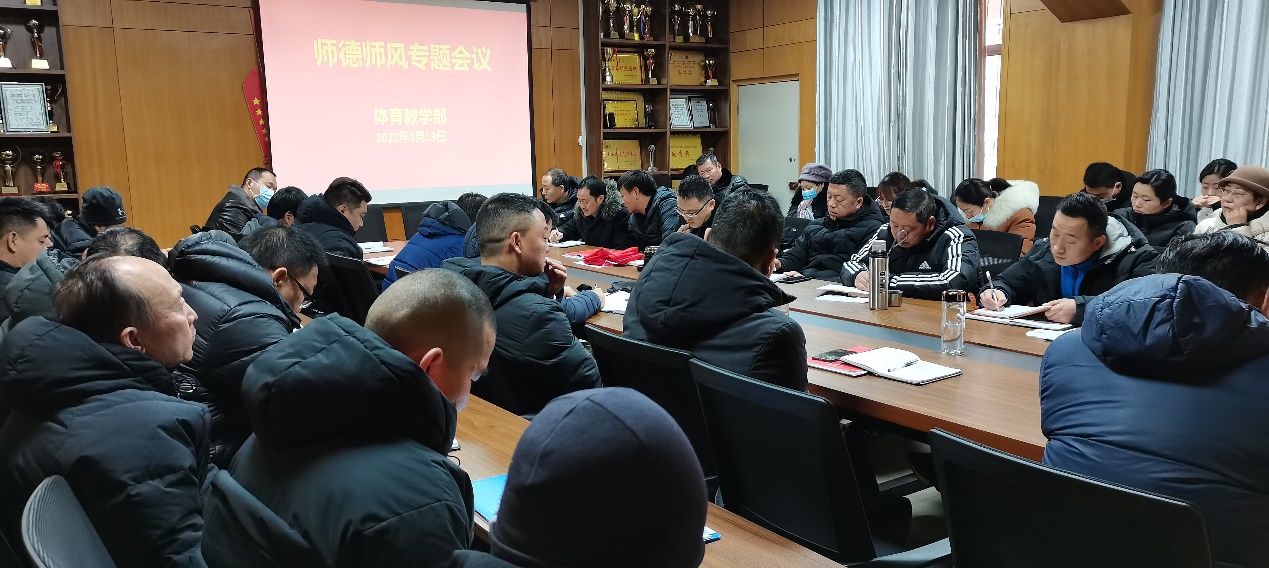学高为师,德高为范。为进一步加强师德师风建设,提高教师师德修养,规范教师从教行为,努力提高体育教学部教师的思想政治素质和职业道德水平,新学期伊始,体育教学部在2022年2月19日上午召开了师德师风建设专题会议,会议由党总支书记张金梁主持,全体教职工参加。