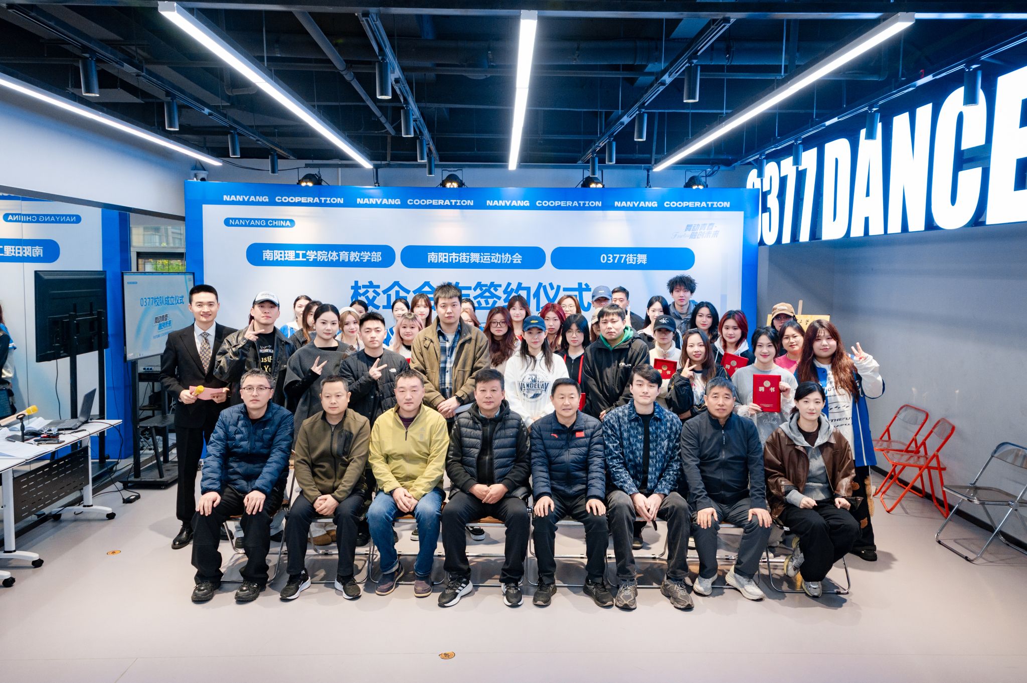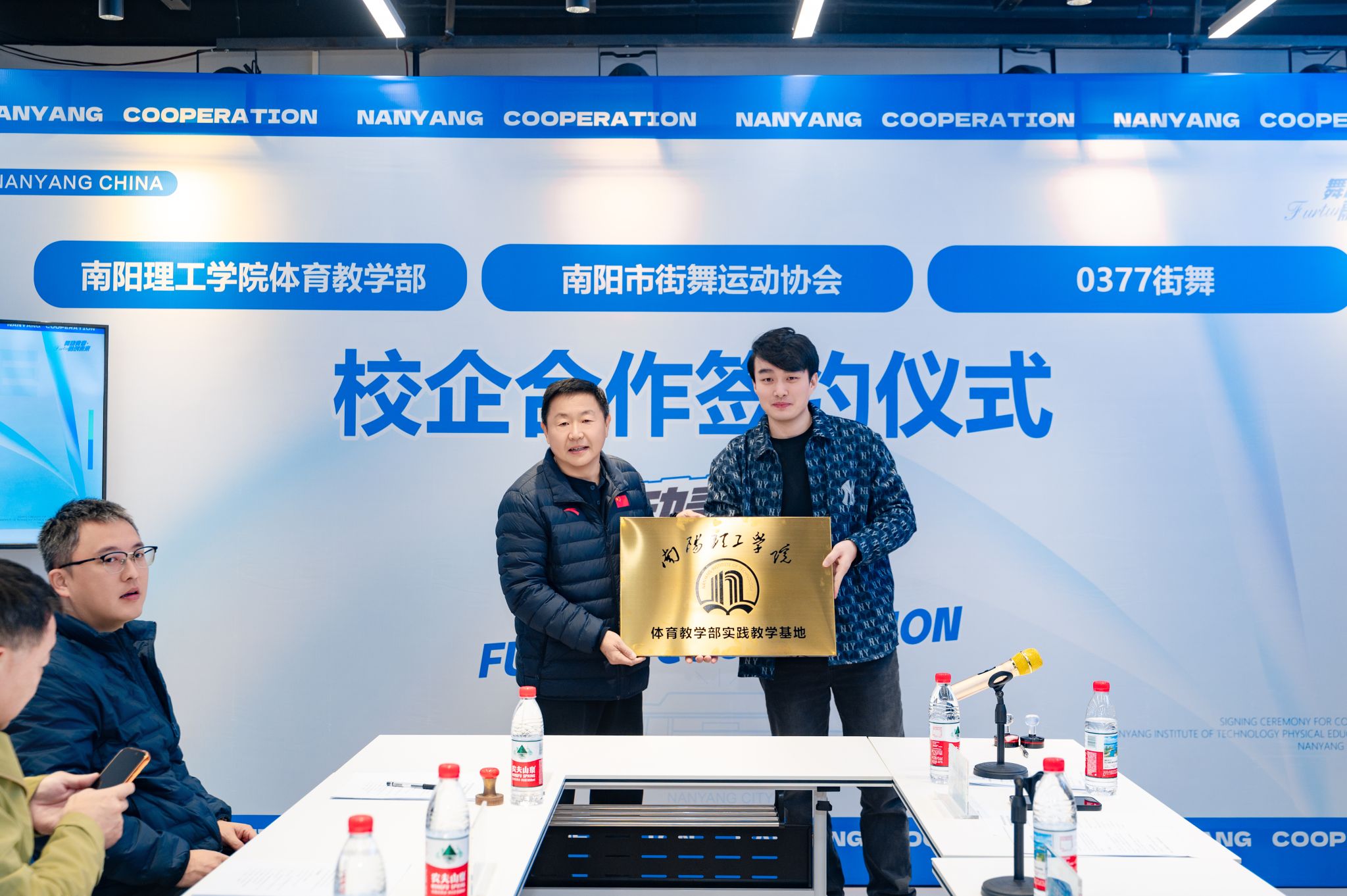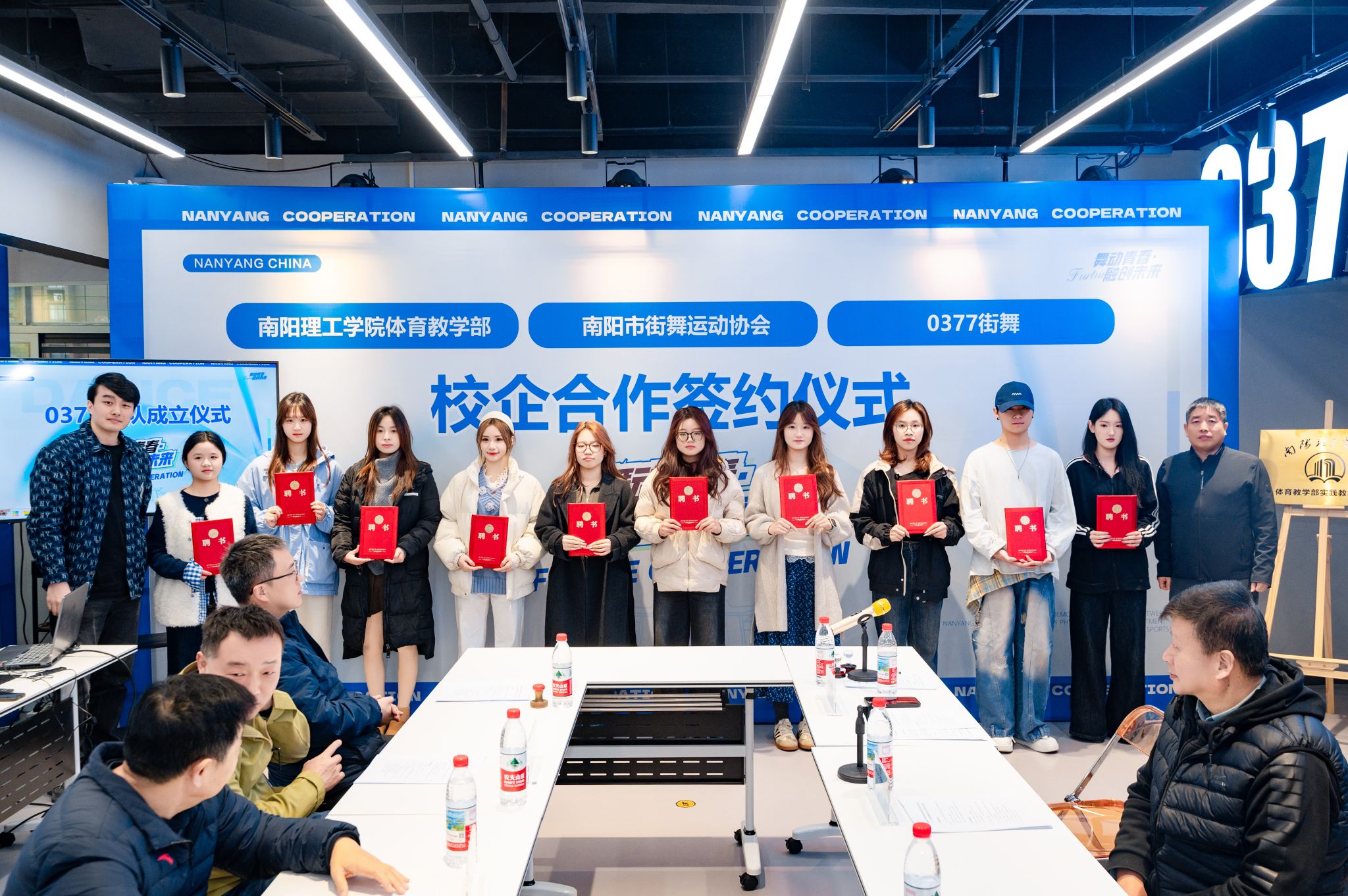 在与会领导与嘉宾的共同见证下,校企双方代表现场签署合作协议,并为“校企合作基地”揭牌。仪式上,南阳理工学院首支官方街舞校队正式成立,与会领导为首批队员颁发了认证证书。
